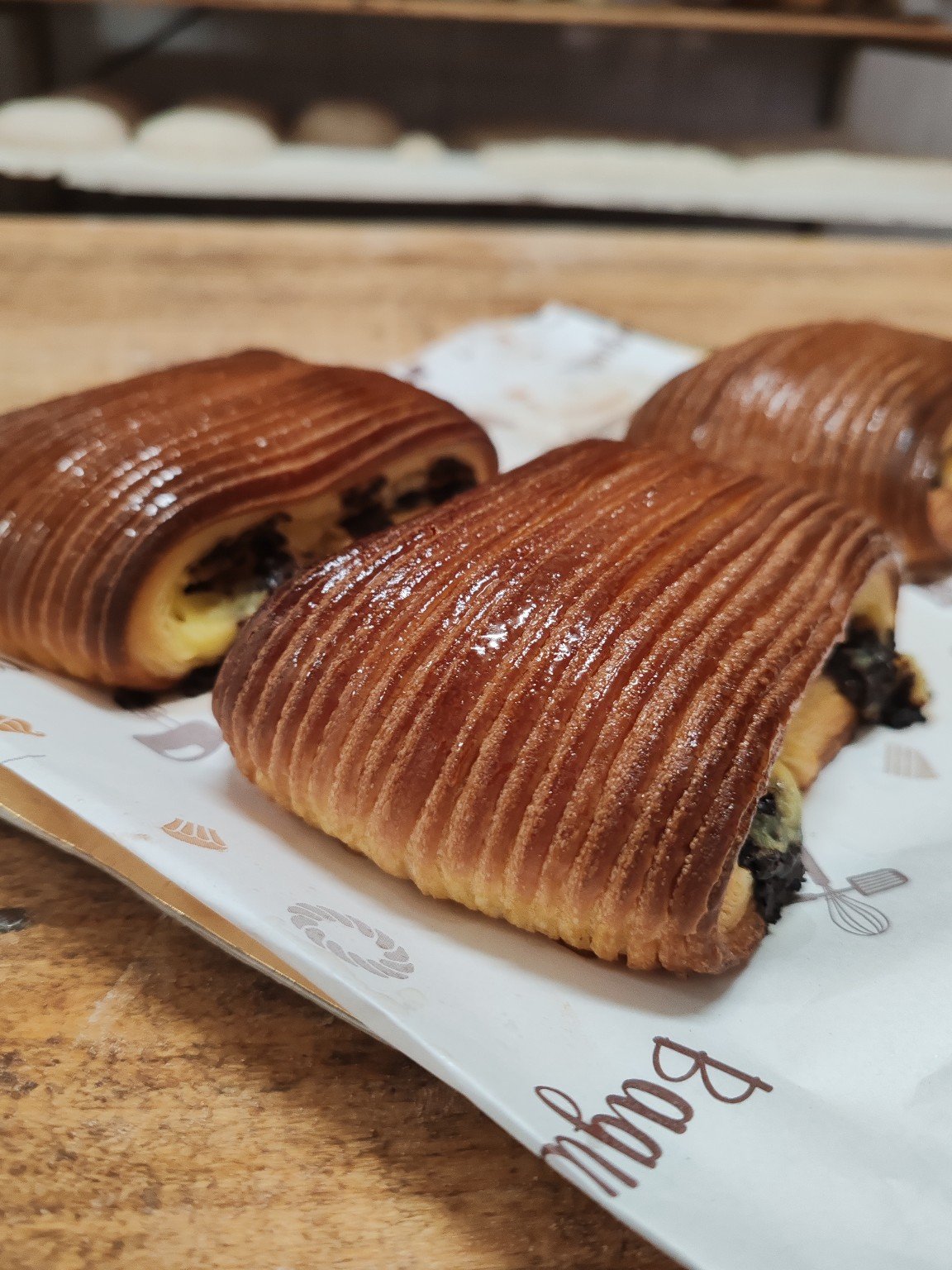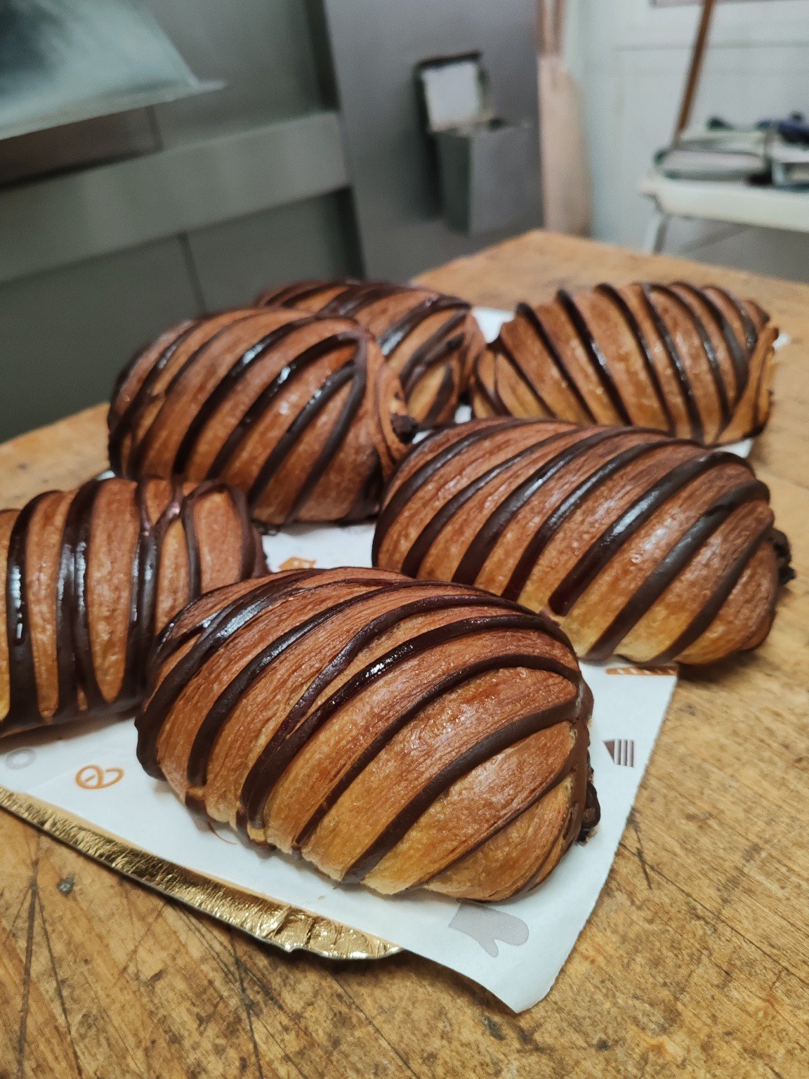 Masa laminada con relleno de chocolate. Hechas a mano, una a una.